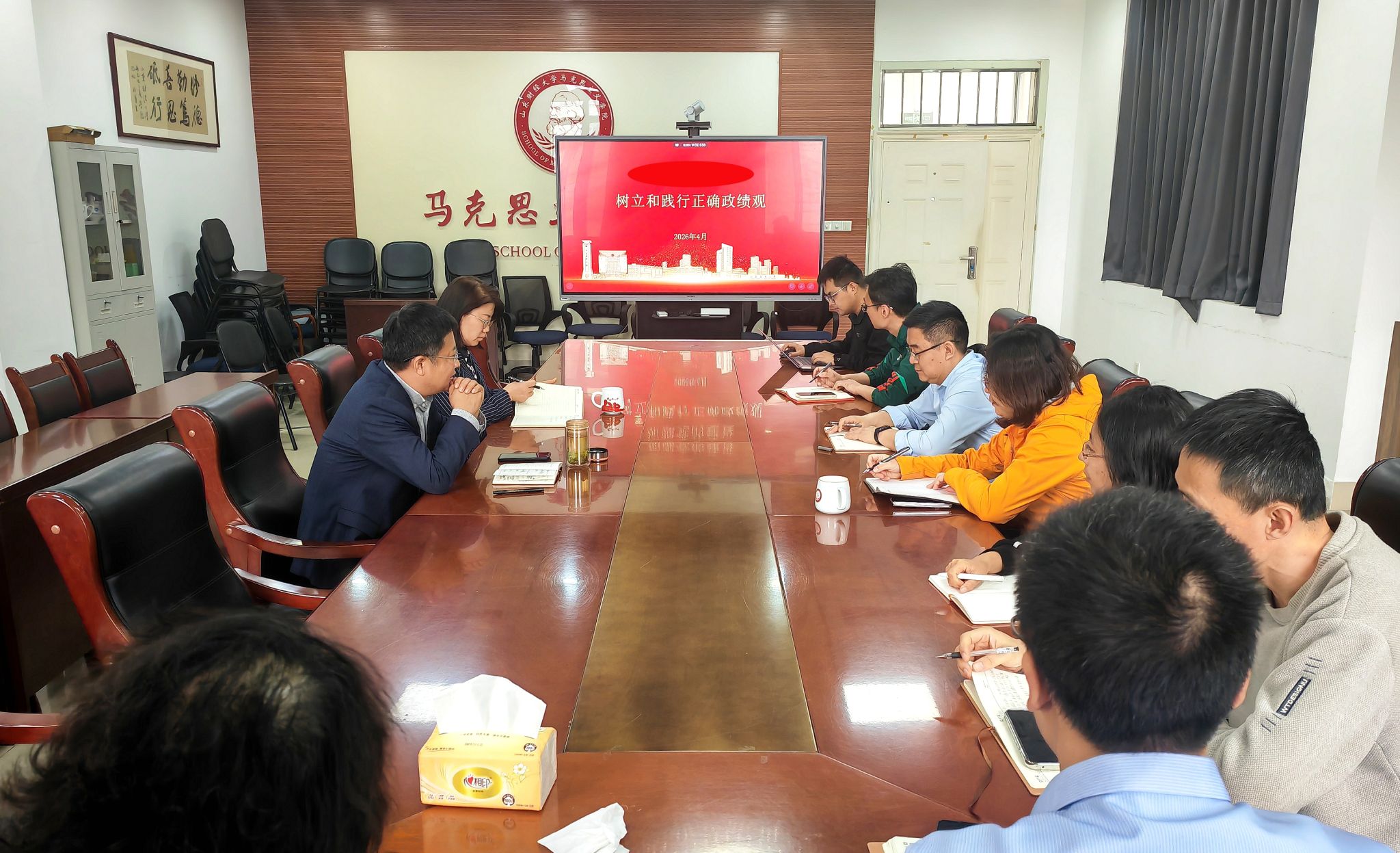 刘国强强调,对于学院来讲,政绩最终要体现为学科的影响力、思想政治理论课课堂质量以及全院师生的获得感和满意度。当前学院正处在高质量发展的关键时期,大家要树立和践行正确政绩观,既要做让师生看得见、摸得着、得实惠的实事,也要做作铺垫、打基础、利长远的好事。一要坚持政治引领,在理论武装中筑牢政绩观根基,将正确政绩观融入思政课教学、学科建设、人才培养全过程;二要坚持问题导向,坚决反对形式主义、官僚主义,杜绝“形象工程”“面子工程”,把精力和资源集中到破解学院发展难题、服务师生成长需求上来;三要坚持实干为要,以钉钉子精神抓落实,在制度建设、管理服务、协同育人中体现担当作为,以实实在在的发展成果检验政绩观成效;四是要坚持服务师生,对待师生要有“温度”,不能等着师生来“求”办事,而要主动了解教学科研需求,优化办事流程,提供便利。