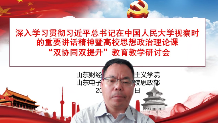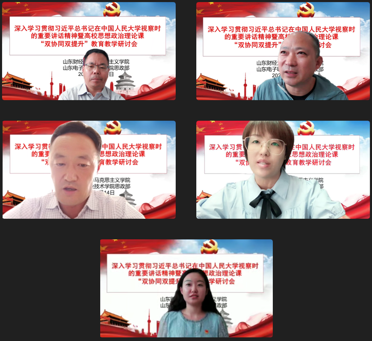 为深入贯彻习近平总书记关于教育的重要论述特别是学校思政课教师座谈会精神,贯彻落实《山东省大中小学思政课“双协同、双提升”项目工作方案》,6月14日下午,我院与山东电子职业技术学院思政部联合召开深入学习贯彻习近平总书记在中国人民大学考察时的重要讲话精神暨高校思想政治理论课“双协同、双提升”教育教学研讨会。本次会议采用线上方式,围绕习近平总书记在中国人民大学考察时的重要讲话精神学习和高校思想政治理论课教育教学工作展开研讨。会议由徐莹院长主持,双方教师代表近40人参会。