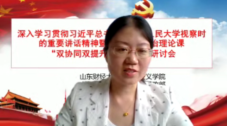 会议发言阶段,与会代表们围绕深入学习贯彻习近平总书记在中国人民大学考察时的重要讲话精神,就坚定思政课教师的职业自信、如何讲好新时代的思政课、新时代思政课教师的使命和担当、“大思政课”如何善用之、思政课程的教学经验和方法总结、线上教学经验交流及在线课程建设经验、新媒体技术的使用和推广等主题进行深入分析和研讨。与会双方各派出4名教师代表分别就相关主题做会议发言。我院毛玉美教授就各位代表的发言进行了集中点评。研讨会最后由徐莹院长和山东电子职业技术学院思政部张同胜主任进行会议总结。
