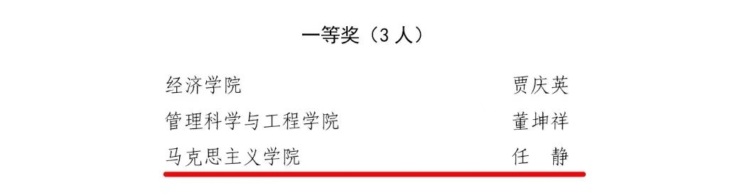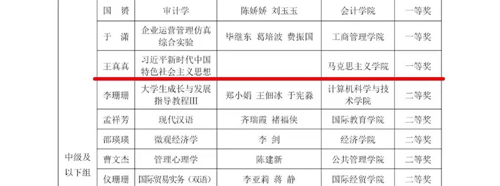 山东财经大学2023年度教学创新大赛是山东财经大学根据山东省教育厅《关于举办2023年度山东省普通高等学校教师教学创新大赛的通知》(鲁教高函[2023]1号)要求举办的教学创新大赛,同时开展省赛选手推荐工作,旨在加强课程建设和新文科建设,落实立德树人根本任务,推动信息技术与高等教育教学融合创新发展。大赛根据主讲教师专业技术职务等级,分正高组、副高组、中级及以下组3个组别,另单设课程思政组别,共分4个组别。大赛共评选出一等奖9名、二等奖13名、三等奖18名。同时学校根据省教育厅分配的推荐名额,从校赛获奖教师中择优推荐参加省赛。省教育厅根据省赛成绩择优推荐参加全国比赛。其中,我院王广教授及其团队成员蔺淑英教授和王静老师,杨海波副教授及其团队成员闫杰副教授、王真真老师分别在正高组、副高组、中级及以下组名列前茅。