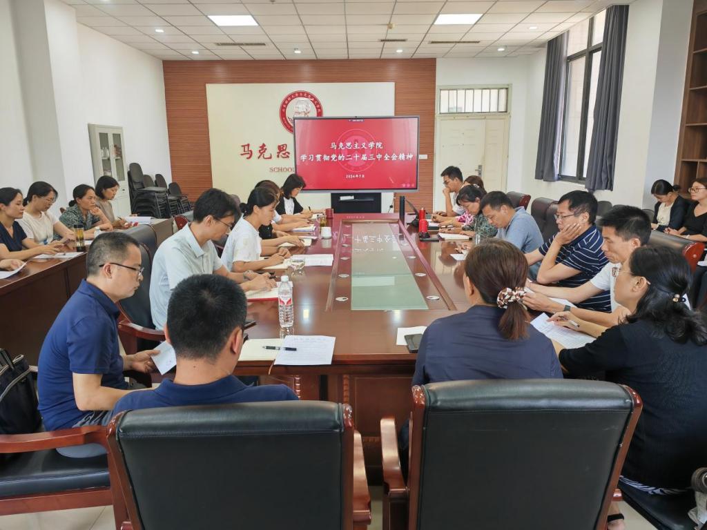 7月22日下午,马克思主义学院召开党委理论学习中心组(扩大)会议,传达学习党的二十届三中全会精神。党委书记石伟主持学习,学院党委理论学习中心组成员、各党支部书记、党员教师代表参加学习。