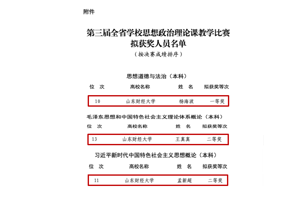 近日,山东省教育厅公布了第三届全省学校思想政治理论课教学比赛评选结果,我院思政课教师杨海波、王真真、孟新超在比赛中荣获本科组一等奖1项,二等奖2项。