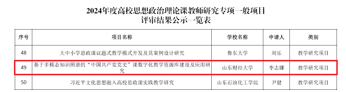 近日,教育部社会科学司对2024年度高校思想政治理论课教师研究专项一般项目评审结果进行了公示。本年度共评选出立项项目200项,其中教学研究项目101项、教学方法改革择优推广项目10项、优秀中青年思政课教师择优资助项目30项、教学研究青年项目59项。我院李志娜老师的《基于多模态知识图谱的“中国共产党党史”课数字化教学资源库建设及应用研究》获批教学研究项目。