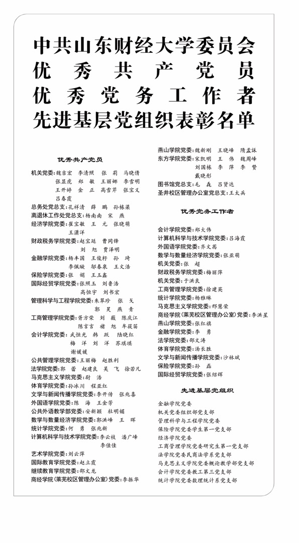 6月28日,学校召开“党建工作会议暨‘两优一先’表彰大会”,马克思主义学院党委概论教学部党支部荣获先进基层党组织荣誉称号,徐莹同志荣获山东教育系统优秀共产党员、邢慧荣同志荣获山东财经大学优秀党务工作者、尉浩同志荣获山东财经大学优秀共产党员荣誉称号。两优一先,全面受表彰,这是对马院党建工作成绩的充分肯定!马院党委将继续抓好党建工作不放松,各位获奖同志也都表示要不忘初心、牢记使命,继续奋斗,努力创造新的业绩!