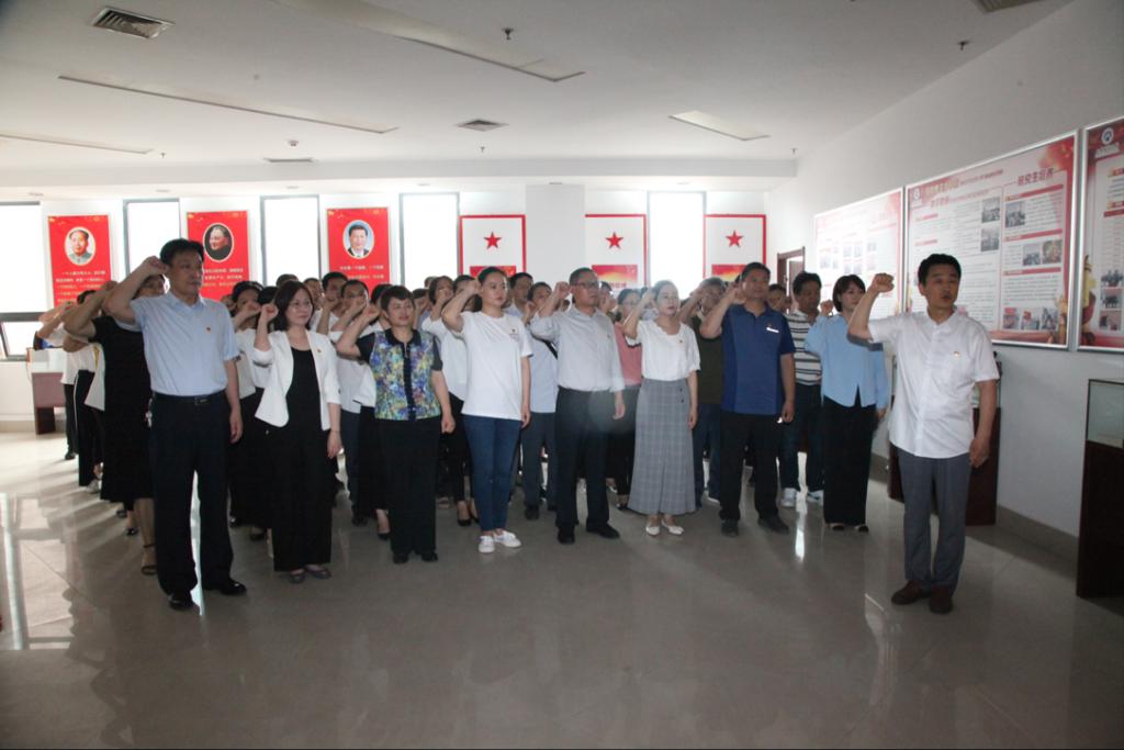 首先进行第一项活动:党员宣誓。全场肃立,面对鲜艳的党旗,郄书记带领全体党员举起右拳庄严宣誓:“我志愿加入中国共产党,拥护党的纲领,遵守党的章程,履行党员义务,执行党的决定......”,铿锵有力的誓言响彻整个会议室。声声誓言,表达了身为新时代共产党员的责任与担当,更许下了对党忠诚、永不叛党的坚定承诺。参加宣誓的党员纷纷表示,组织开展党员集体宣誓活动,既是对建党100周年的隆重纪念,也是对全体党员的深刻党性教育,一定要永远铭记向党和人民许下的郑重承诺,不忘初心、牢记使命,始终坚定理想信念,坚守人民情怀,坚持实干担当,用毕生精力践行庄重誓言,传承红色基因、赓续红色血脉,切实发挥党员先锋模范作用。