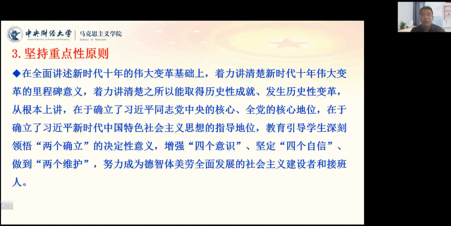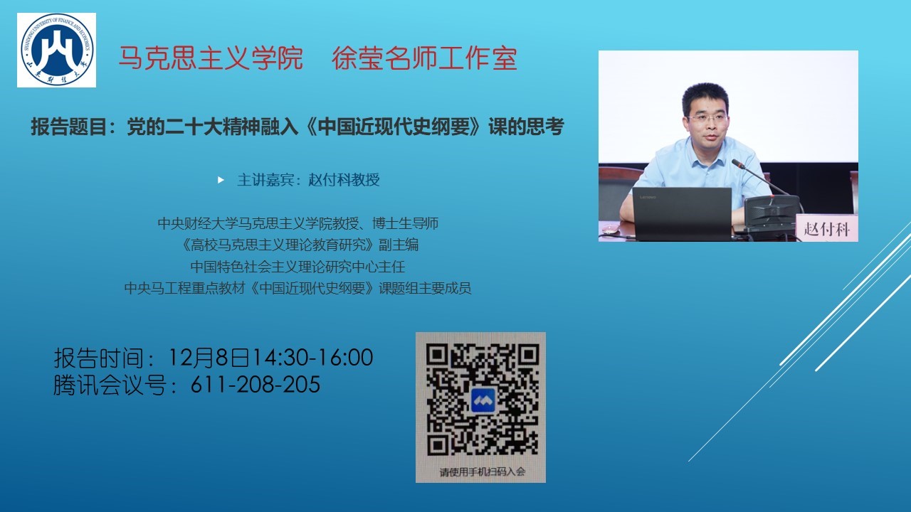 12月8日,应马克思主义学院、徐莹名师工作室邀请,中央财经大学马克思主义学院博士生导师赵付科教授,通过线上为我院教师做了题为《党的二十大精神融入<中国近现代史纲要>课的思考》的专题讲座。讲座由院长徐莹主持,《纲要》课教研室全体老师及其他教研室的部分老师聆听了讲座。