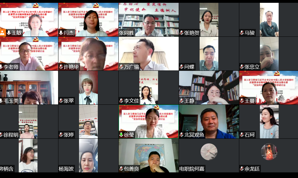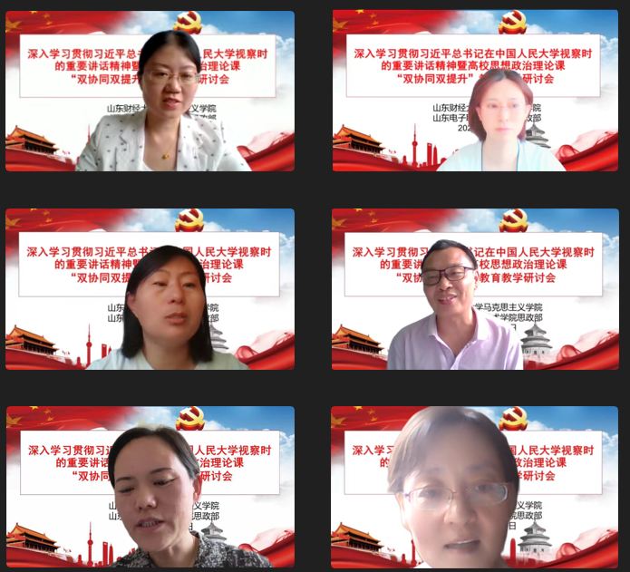 为深入贯彻习近平总书记关于教育的重要论述特别是学校思政课教师座谈会精神,贯彻落实《山东省大中小学思政课“双协同、双提升”项目工作方案》,6月14日下午,我院与山东电子职业技术学院思政部联合召开深入学习贯彻习近平总书记在中国人民大学考察时的重要讲话精神暨高校思想政治理论课“双协同、双提升”教育教学研讨会。本次会议采用线上方式,围绕习近平总书记在中国人民大学考察时的重要讲话精神学习和高校思想政治理论课教育教学工作展开研讨。会议由徐莹院长主持,双方教师代表近40人参会。